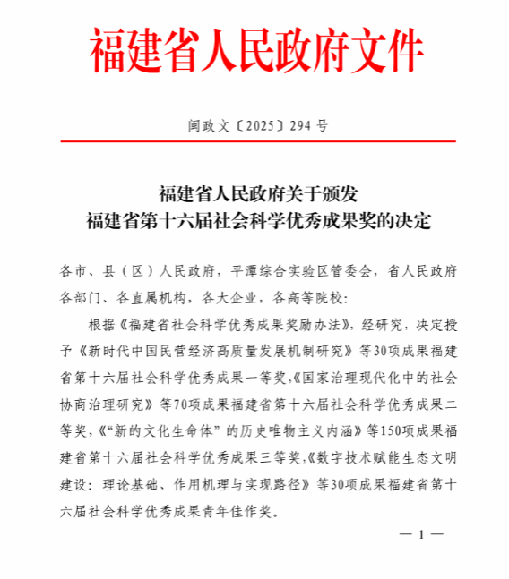 2026年1月9日,福建省人民政府公布了《福建省人民政府关于颁发福建省第十六届社会科学优秀成果奖的决定》(闽政文〔2025〕294号),经评审,我院教师的2项成果荣获福建省第十六届社会科学优秀成果三等奖,分别是:洪祥骏副教授、陈丽芳副教授与合作者共同撰写的论文《地方绿色信贷贴息政策效果研究——基于财政与金融政策协调视角》,以及陈丽芳与合作者共同完成的论文《Foreign ownership and corporate excess perks(境外投资者持股与公司高管过度在职消费)》。